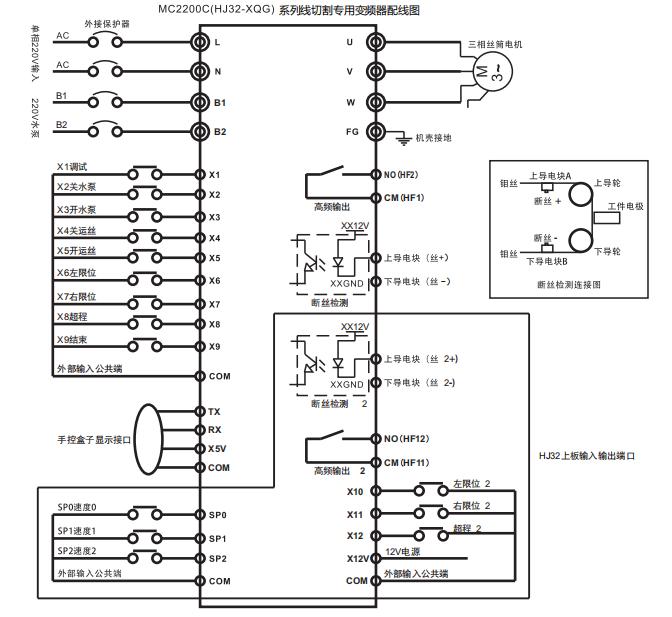 MC2200C /HJ32、MC3300/HJ33 線切割專用變頻器是我司針對線切割機床市場推出的一系列專用變頻器,集成了傳統通用變頻器功能+PLC(單片機控制)功能+外置手控盒功能;使用我司MC2200C/HJ32、MC3300/HJ33 系列線切割專用變頻器只需將外部信號直接接入相對應端口即可實現所有控制,與通用變頻器相比省去眾多不必要的參數設置,安裝接線使用更簡單方便。