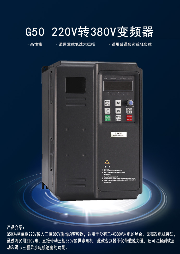5800系列單相220V輸入三相380V輸出的變頻器,適用于沒有三相380V用電的場合,無需改電機(jī)接法,通過將民用220V電,直接帶動三相380V的異步電機(jī),此款變頻器不僅帶載能力強(qiáng),還可以起到軟啟動和調(diào)節(jié)三相異步電機(jī)速度的功能。
